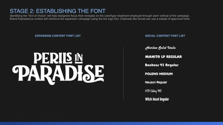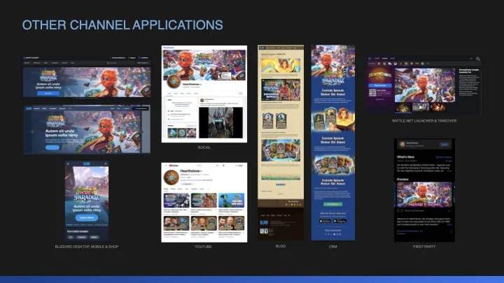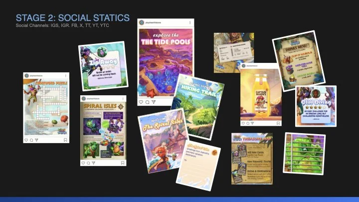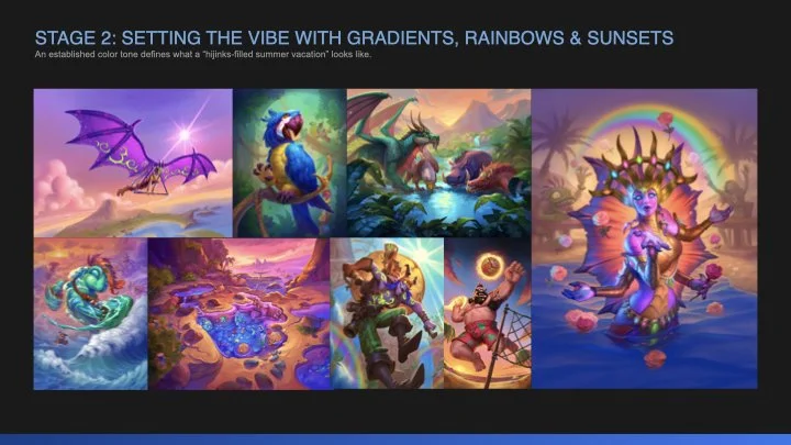 Over two major development phases, cross team collaboration and early creative alignment is essential in the development of expansion key art/logo and visual campaign execution. Below represents the process which was applied to Hearthstone’s “Perils in Paradise” expansion.